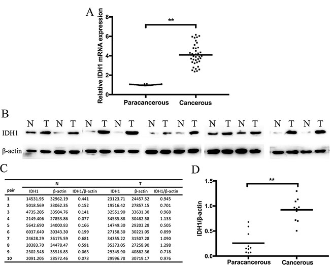 Figure 2: IDH1 expression in cancerous tissue compared with that in paracancerous tissue was detected at (A) mRNA level by RT–PCR. The 2−ΔΔCt method was used for calculating the IDH1 expression. The relative expression was 4.04 ± 1.05 vs. 1.01 ± 0.05 (P < 0.001). (B) Protein level was detected by Western blot analysis, the intensity values of 10 pairs of tissues are shown in (C) and the IDH1/β-actin values of cancerous and paracancerous tissues are compared in (D). Abbreviations: T, cancerous tissues; N, paracancerous tissues.