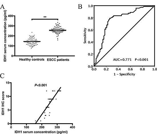 Therefore, IDH1 is significantly upregulated in ESCC tissue and serum. IDH1 shows potential as a biomarker for both diagnosis and prognosis of ESCC.