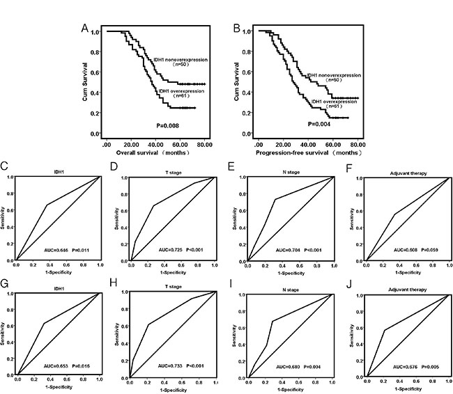 Figure 4: (A and B) Kaplan–Meier analysis for overall survival and progression-free survival of ESCC patients with IDH1 non-overexpression or overexpression. (C–F) ROC–AUC curve analysis for OS prediction of IDH1, T stage, N stage and adjuvant therapy. (G–J) ROC-AUC curve analysis for PFS prediction of IDH1, T stage, N stage and adjuvant therapy.