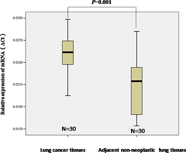 Figure 1: The relative levels of STIM1 mRNA expression was detected by qRT-PCR. The level of STIM1 mRNA expression was higher in lung tumors than that in adjacent non-neoplastic lung tissues. Median values are indicated, and the Mann-Whitney U test was performed.