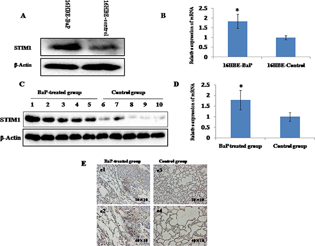 Figure 2: STIM1 expression in malignant 16HBE cells transformed by BaP and BaP-treated mice lung tissues were measured by qRT-PCR and western blot assay. The levels of STIM1 protein A. and mRNA B. were higher in malignant 16HBE cells transformed by BaP than those in control cells. The levels of STIM1 protein C. and mRNA D. were higher in BaP-treated mice lung tissues than those in the control group. The level of STIM1 in BaP-treated mice lung tissues was detected by immunohistochemistry E. Plates e1 (200×) and e2 (400×) represent the lung sections of BaP-treated group, and plates e3 (200×) and e4 (400×) represent the lung sections of the control group. The BaP-treated group exhibited strong cytoplasmic and nuclear STIM1 staining in some cells (e1 and e2). * P < 0.05.