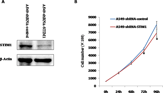 We investigated the effects of STIM1 silencing on the proliferation of A549 cells. Our results indicated that the significantly slower growth rate was observed in A549-shRNA-STIM1 cells as compared to A549-shRNA-control cells at 72 h and 96 h (P < 0.05).