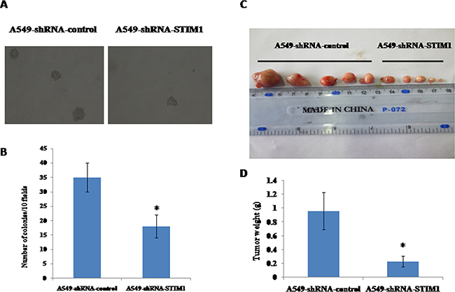 Figure 4: Effects of silencing STIM1 on colony formation and tumor growth in mouse xenograft models. Dramatically decreased colony formation was observed in A549-shRNA-STIM1 cells compared with A549-shRNA-control cells A and B. The mean of tumor weight was significantly reduced in A549-shRNA-STIM1 cells compared with A549-shRNA-control cells C and D. *P<0.05.