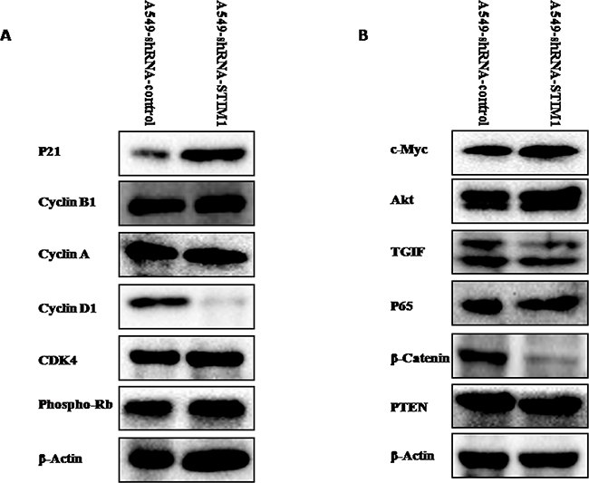 Figure 6: Effects of silencing STIM1 on the expression of several proteins. Western blot analysis showed that silencing STIM1 decreased cyclin D1, TGIF and β-catenin expression and increased p21 expression.