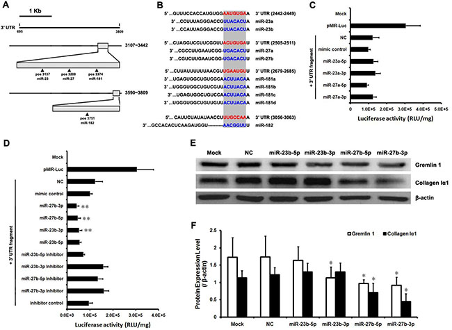Figure 4: The miR-23b/27b cluster downregulates gremlin1 expression. (A) Prediction of conserved miRNAs targeting the 3′-UTR of rat gremlin1 mRNA using Targetscan online service. Conserved binding sites for miR-23a/b, miR-27a/b and miR-181a/b/c/d were predicted in 3107–3442 nt region (G3-23-1) and for miR-182 in the 3590–3809 nt region (G3-23-3). (B) Nine conserved miRNAs, including miR-23a/b, miR-27a/b, miR-181a/b/c/d and miRNA-182, could recognize and bind the 3′-UTR of gremlin1 mRNA. (C–D) Verification of interactions between rat miR-23a/27a or miR-23b/27b and 3′-UTR of rat gremlin1 mRNA via determination of luciferase activities of HSC-T6 cells co-transfected with pMIR-Luc-3′-UTR and miRNA mimics or inhibitors. **p < 0.01 for comparing between three groups data: miRNA mimic comparing with mimic control; miRNA mimic comparing with its inhibitor; miRNA mimic inhibitor comparing with inhibitor control. (E–F) Western blot assay confirmed that gremlin1 is a cognate target of post-transcriptional repression by miR-23b/27b. Downregulation of gremlin1 expression led to inhibition of collagen Iα1 synthesis. Data in histogram figures represent means ± s.d (n = 3; *P < 0.05).