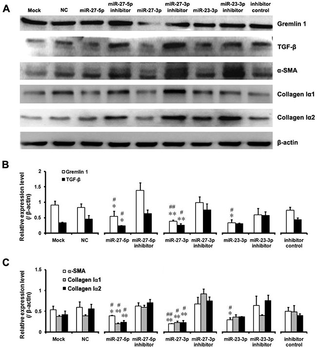 Figure 5: Downregulation of gremlin1 expression by the miR-23b/27b cluster leads to decreased expression of hepatic fibrosis-related factors. (A–C) Expression levels of hepatic fibrosis-related factors, including α-SMA, TGF-β, collagen Iα1 and collagen Iα2, were critically assessed via western blot of the proteins from HSC-T6 cells transfected with miR-23b/27b mimics, inhibitors, negative control or inhibitor control, respectively. Relative protein level of Gremlin1, TGF-β, collagen Iα1, collagen Iα2 and α-SMA vs their inhibitors, respectively and all results were expressed as means ± SD (n = 3; *P < 0.05, **P < 0.01). Relative protein level of Gremlin1, TGF-β, collagen Iα1, collagen Iα2 and α-SMA vs their NC (Negative control), respectively and all results were expressed as means ± SD (n = 3; #P < 0.05, ##P < 0.01).
