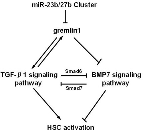 In summary, our findings clearly demonstrate that gremlin1 promotes HSC activation and hepatic fibrosis through impairing the balance between BMP-7 and TGF-β1 signaling. The miR-23b/27b cluster suppresses HSC activation by directly binding gremlin1 mRNA 3′-UTR and downregulates gremlin1 expression to correct the imbalance of TGF-β and BMP-7 signal transduction (Figure 6). Data from the current study highlight the utility of the miR-23b/27b cluster as a novel target for manipulation in clinical therapy of hepatic fibrosis.