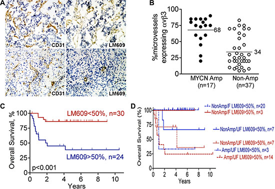 Figure 1: Higher expression of integrin αvβ3 on microvessels of high-risk stage 3 neuroblastoma. Serial frozen sections of 54 cases of stage 3 neuroblastoma, as summarized in Table 1, were stained for integrin αvβ3 (mAb LM609) and CD31. The fraction of all vessels (anti-CD31) that also express integrin αvβ3 (LM609 antibody) was determined as detailed in “Materials and Methods”, and used for the analysis in panels B–D. (A) Example of stage 3 neuroblastomas with high (top panels) or low (bottom panels) microvessel αvβ3 expression: immunohistochemistry for CD31 is in left panels and αvβ3 (LM609 antibody) in right panels. Photographed at 100× magnification. (B) Scatter plot of percent microvessels expressing integrin αvβ3 as function of MYCN amplification status in the 54 stage 3 neuroblastomas analyzed as in panel A. ● – MYCN amplified tumors; ○ – MYCN non-amplified tumors. p < 0.001 by unpaired t-test. (C) Kaplan-Meier plot of overall survival of patients with stage 3 neuroblastoma according to percent microvessels expressing integrin αvβ3 (< 50% or > 50% of vessels staining with LM609 antibody). p < 0.001. (D) Kaplan-Meier plot of overall survival comparing < 50% or > 50% microvessels expressing integrin αvβ3 (LM609 antibody) in the three risk groups defined by MYCN-amplification and Shimada classification (MYCN amplified/unfavorable Shimada, MYCN non-amplified/unfavorable and Shimada MYCN non-amplified/favorable Shimada). p = 0.58 between < 50% and > 50% αvβ3 expression after adjusting for the risk groups.