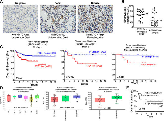 Figure 2: The tumor suppressor gene, PTEN is expressed in stage 3 neuroblastoma tumors. Frozen sections of 53 cases of stage 3 neuroblastoma, contiguous to those analyzed in Figure 1, were stained for PTEN as detailed in “Materials and Methods” and used for the analysis in panels (A–C). (A) Examples of the three immunohistochemical staining patterns of PTEN in the stage 3 neuroblastomas. Left panel: negatively-staining tumor; Middle panel: focally-positive tumor; Right panel: diffusely positive tumor. Images were photographed at 400× magnification. (B) Kaplan-Meier plot for overall survival as function of PTEN staining pattern. p = 0.061 by the log-rank test. (C) Scatter plot of percent microvessels expressing integrin αvβ3 as a function of PTEN staining pattern. ● – Focal or negative PTEN stain; ○ – Diffusely positive PTEN stain. p < 0.001 by unpaired t-test. Middle panel: focally-positive tumor; Right panel: diffusely positive tumor. Images were photographed at 400× magnification. (B) Kaplan-Meier plot for overall survival grouped by PTEN staining pattern. p = 0.061 by log-rank test. (C) Kaplan-Meier plots for overall survival as function of PTEN expression in a cohort of neuroblastoma patient samples (498 samples) or a subgroup of it, as indicated. (D) Plots showing PTEN expression on different subset of neuroblastoma patient samples from the Westermann cohort. Patients grouped by INSS stages, current risk stratification stages or the presence of chromosome 1p deletion are shown. P value for ANOVA or T-test is shown in each plot. (E) Scatter plot of percent microvessels expressing integrin αvβ3 as a function of PTEN staining pattern. ● – Focal or negative PTEN stain; ○ – Diffusely positive PTEN stain. p < 0.001 by unpaired t-test. Middle panel: focally-positive tumor; Right panel: diffusely positive tumor. Images were photographed at 400× magnification. B. Kaplan-Meier plot for overall survival grouped by PTEN staining pattern. p = 0.061 by log-rank test. C. Scatter plot of percent microvessels expressing integrin αvβ3 grouped by PTEN staining pattern. ●● – Focal or negative PTEN stain; ○○ – Diffusely positive PTEN stain. p < 0.0001 by unpaired t-test.