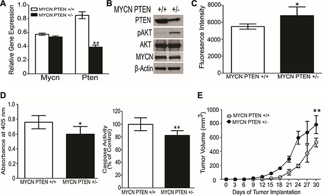 For caspase-3 activity (apoptosis studies), MYCN PTEN +/+ and MYCN PTEN+/− (2 × 106) cells were seeded in 10 cm dish. After 24 hours cells were collected, and caspase-3 activity was assessed with the Caspase-3 assay kit following manufacturer’s protocol (Roche). Fluorescence intensity was measured by fluorescence spectrophotometry (Infinite M200, Tecan Instruments, Germany) at 400 nm excitation and 505 nm emission wavelengths. All readings were standardized using the fluorescence intensity of an equal volume of free 7-amino-4- methyl-coumarin (AMC) solution.