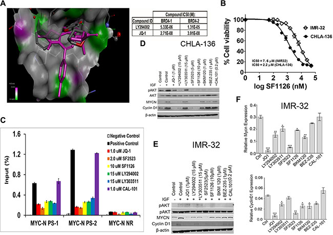 IMR-32 cells were treated with/without JQ1 (1 μM), SF2523 (2 μM), SF1126 (10 μM), LY294002 (15 μM), LY303511 (15 μM) and CAL 101 (1 μM) for 24 hours and then cross-linked using 1.1% formaldehyde, washed with PBS and frozen at −80°C. Antibody-conjugated beads were prepared by blocking 50 μL of protein A/G agarose beads with 0.5% BSA (w/v) followed by incubation with 6.25 μg of anti-BRD4 antibody, 5 μg of normal rabbit IgG. Cross-linked cells were lysed, washed and sonicated, essentially as described [29, 33, 66]. Sonicated lysates were supplemented with Triton X-100 to 1% and cleared. Aliquots were reverse-crosslinked and digested with RNase A overnight and purified with QIAquick PCR Purification Kit (Qiagen, Hilden, Germany) for quantification of input chromatin. Sonicated, cleared chromatin (15 μg) was incubated overnight at 4°C with antibody-conjugated agarose beads, and beads were washed as in [29, 33]. Chromatin was eluted in the buffer (50 mM Tris-HCl pH 8, 10 mM EDTA, and 1% SDS), reverse cross-linked and digested with RNase A overnight and then purified. ChIP and input DNA were analyzed by real-time PCR analysis using previously published primers against the MYCN promoter site 1 (forward) TTTGCACCTTCGGACTACCC and (reverse) TTTGACTGCGTGTTGTGCAG; MYCN promoter site 2 (forward) TCCTGGGAACTGTGTTGGAG and (reverse) TCCTCGGATGGCTACAGTCT; MYCN-negative region (forward) TATCACCGTCCATTCCCCG and (reverse) TTGGAGGCAGCTCAAAGACC [29, 33]. Fold enrichment was analyzed by calculating the immunoprecipitated DNA percentage of input DNA in triplicate for each sample.