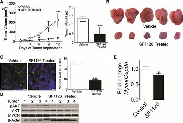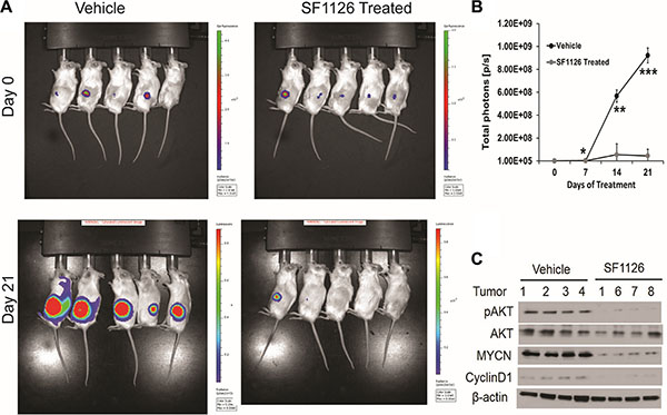 Mouse experiments were performed in accordance with animal protocols approved by the Institutional Animal Care and Use Committee at University of California, San Diego. To study the role of PTEN in neuroblastoma tumor progression, 5 × 106 neuroblastoma-derived tumor cells obtained from MYCN PTEN+/+ or MYCN PTEN+/−transgenic mice were implanted subcutaneously in 6 week old female nu/nu mice. Tumor growth was monitored 2−3 times a week, until tumors were harvested on day 30. Tumor volume was calculated as: Volume = 0.5 × length × (width)2. For SF1126 experiments, 5 × 106 NB9464 murine neuroblastoma cells were injected subcutaneously in female nu/nu mice. When tumors reached 40 mm3, animals were randomized to two groups and SF1126 (50 mg/kg) or vehicle was administered subcutaneously five times a week. For CHLA-136-Fluc experiments, 5 × 106 cells were subcutaneously implanted in NSG mice and after 15 days of tumor implantation, mice were randomized into two groups and one group is vehicle and another group is treated with 50 mg/kg SF1126 (five times a week) for 3 weeks. Tumor growth was assessed weekly by bioluminescence imaging 15 minutes after intra-peritoneal injection of a D-luciferin potassium salt solution (1.5 mg/mouse) using a Xenogen IVIS-200 system (Caliper Life Sciences). Photons emitted were quantified with the Living Image 3.0 software (Caliper Life Sciences).