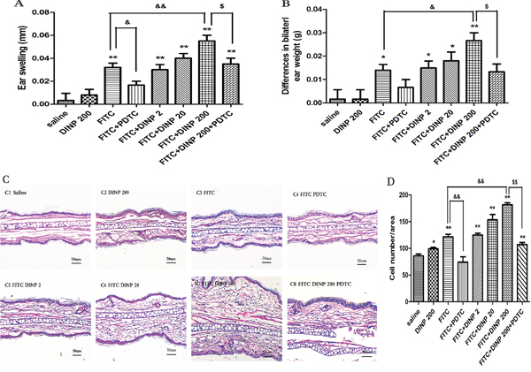 Figure 1: Effects of oral DINP exposure on skin lesions induced by FITC. A. Thickness of the ears. B. Differences in bilateral ear weight. * p<0.05, ** p<0.01, compared with saline group; && p<0.01, compared with FITC group; $$ p<0.01, compared with FITC+DINP200 group (n=6). C. Histological changes in the ears (stained with H&E). C1, Saline C2, DINP200 C3, FITC C4, FITC+ PDTC C5, FITC+ DINP2 C6, FITC+ DINP20 C7, FITC+DINP200 C8, FITC+DINP200+PDTC. D. Evaluated as the number of cells infiltrating. ** p<0.01, compared with saline group; & p<0.05, compared with FITC group; $ p<0.05, compared with FITC+DINP200 group (n=6).