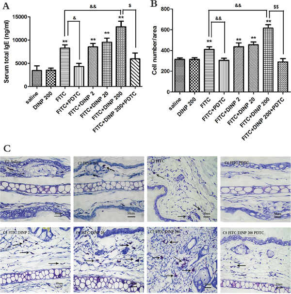 Figure 2: A. Total IgE concentrations (ng/ml). B. Number of mast cells. C. Stained with toluidine blue in the right ear in mice, mast cells were stained purple color (black arrow). C1–C8 and negative represent different exposure groups (Saline, DINP200, FITC, FITC+ PDTC, FITC+ DINP2, FITC+ DINP20, FITC+DINP200, FITC+DINP200+PDTC).