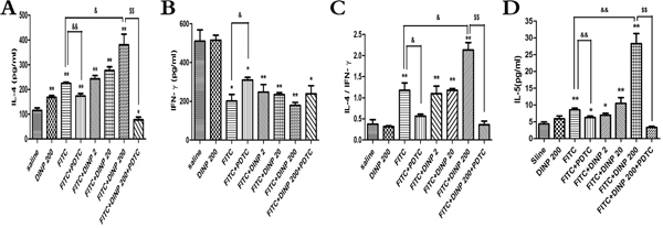 Figure 3: A. IL-4 concentrations. B. IFN-γ concentrations. C. The ratio of IL-4 and IFN-γ. D. IL-5 concentrations.* p<0.05, ** p<0.01, compared with saline group; & p<0.05, && p<0.01, compared FITC group with FITC+PDTC group and FITC+DINP200 group; $ P<0.05, $$ p<0.01, compared FITC+DINP200 group with FITC+DINP200+PDTC group (n=6).