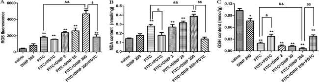 Figure 4: A. ROS fluorescence in ear tissue. B. MDA concentrations in ear tissue. C. GSH concentrations in ear tissue. *p<0.05, **p<0.01, compared with saline group; & p<0.05, && p<0.01, compared FITC group with FITC+PDTC group and FITC+DINP200 group; $ P<0.05, $$ p<0.01, compared FITC+DINP200 group with FITC+DINP200+PDTC group (n=6).