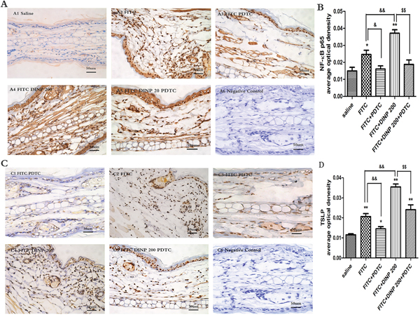 Figure 5: A. Immunohistochemistry for NF-κB p65 (phospho S536). B. The activation scores of NF-κB p65 (phospho S536). C. Immunohistochemistry for TSLP. D. The activation scores of TSLP. *p<0.05, **p<0.01, compared with saline group; & p<0.05, && p<0.01, compared FITC group with FITC+PDTC group and FITC+DINP200 group; $ P<0.05, $$ p<0.01, compared FITC+DINP200 group with FITC+DINP200+PDTC group (n=6).