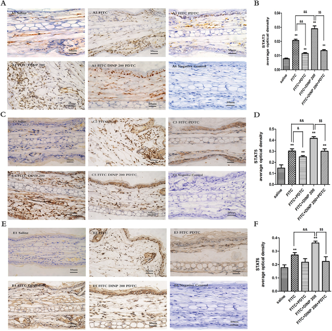 Figure 6: A. Immunohistochemistry for STAT3 (phospho Y705). B. The activation scores of STAT3 (phospho Y705). C. Immunohistochemistry for STAT5 (phospho Y694). D. The activation scores of STAT5 (phospho Y694). E. Immunohistochemistry for STAT6 (phospho Y641). F. The activation scores of STAT6 (phospho Y641). A1–A5, C1–C5, E1–E5 and negative represent different exposure groups (Saline, FITC, FITC+PDTC, FITC+DINP200, FITC+DINP200+PDTC, Negative control). The expression or activation scores were calculated by statistical analysis of optical density of Immunohistochemistry. * p<0.05, ** p<0.01, compared with saline group; & p<0.05, && p<0.01, compared FITC group with FITC+PDTC group and FITC+DINP200 group; $ P<0.05, $$ p<0.01, compared FITC+DINP200 group with FITC+DINP200+PDTC group (n=6).