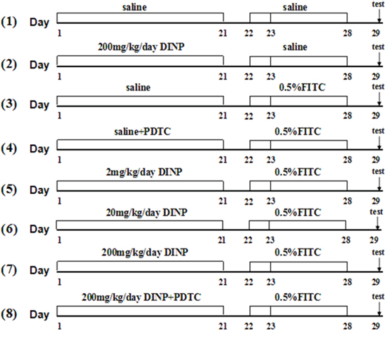 48 male Balb/c mice were randomly divided into 8 groups and treated as depicted in Figure 8. In the first stage, Groups (1)-(8) were gavaged with 2, 20, 200 mg/kg bw/day DINP or saline for 21 days, while groups (4) and (8) also were injected with 60 mg/kg bw/day PDTC. Then Mice were sensitized with 100 μl of 0.5% FITC or saline on days 22 and 23 on their shaved backs and challenged with 0.5% FITC on day 28 on their right ears.