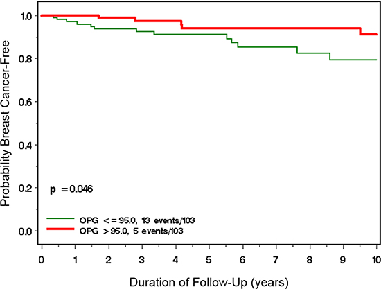 Despite the emerging importance of RANK signaling in breast cancer, no studies have directly measured the association between circulating OPG levels and subsequent breast cancer risk. Thus, we undertook a prospective analysis of plasma OPG levels and breast cancer risk in 206 women with a BRCA1 or BRCA2 mutation that were unaffected by breast cancer at the time of study enrollment.