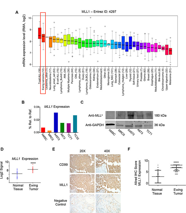 Figure 1: MLL1 is expressed by Ewing sarcoma. (A) CCLE data depicting MLL1 transcript expression. (B) RT-PCR and (C) western blot depicting MLL1 transcript and protein expression in Ewing sarcoma cells, MRC5 fibroblasts and adult bone marrow-derived mesenchymal stem cells (hMSC). (D) Expression array data for MLL1 in 32 Ewing sarcoma tumors compared to 33 samples from 11 normal adult tissues. ****p < .0001. (E) Representative immunohistochemical staining of Ewing sarcoma tumor, showing CD99 (top) and MLL1 (middle). Thyroid (bottom) was negative for MLL1 expression. (F) Scoring of MLL staining in 42 Ewing sarcoma tumors and 22 normal tissue samples (liver, bladder, heart, fat, lung, spleen, pancreas, thymus, stomach, salivary gland, thyroid, uterus, kidney, prostate, testes, tonsil, breast, skin). Normal tissues with high MLL1 expression (Allred score of 6 or greater) included heart, spleen, stomach, pancreas, and salivary gland. ****p < .0001.