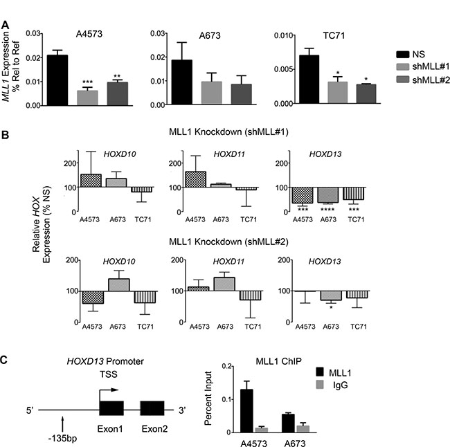 Given the critical role for MLL1 in regulating HOX gene expression during normal development and in leukemia [8, 25, 26], we hypothesized that MLL1 contributes to overexpression of posterior HOXD genes in Ewing sarcoma. To address this we measured expression of posterior HOXD genes 48 hours following shRNA-mediated knockdown of MLL1 (Figure 3A). Studies of altered expression were limited to evaluation of transcript levels due to the lack of specific and authenticated antibodies for HOXD protein expression. Although levels of HOXD10 and HOXD11 changed in some cells, HOXD13 was reproducibly downregulated following acute MLL1 knockdown (Figure 3B). Notably, among the posterior HOXD genes, HOXD13 is the most reproducibly and specifically overexpressed by Ewing sarcoma compared to other tumors and non-malignant tissues (Supplementary Figure S2A and Refs [15, 35]). In addition, knockdown of HOXD13 (Supplementary Figure S2B–S2E), and also of HOXD10 and HOXD11 [35], results in loss of tumorigenicity, verifying the identity of posterior HOXD genes as critical oncogenes in Ewing sarcoma. Directed ChIP-PCR assays confirmed that the presence of H3K4me3 at the HOXD13 promoter is associated with binding of MLL1 (Figure 3C) [15, 21]. Whether MLL1 or another KMT protein mediates the H3K4me3 modification cannot be ascertained from these data. Nevertheless, given that MLL1 directly activates HOX genes in embryonic development, our data lend strong support for the hypothesis that MLL1 also contributes to epigenetic activation of HOXD13 in Ewing sarcoma. Thus, these data together show that continued high level expression of both MLL1 and HOXD13 are required for maintenance of the oncogenic phenotype of Ewing sarcoma and that HOXD13 overexpression is associated with H3K4me3 and MLL1 binding at its promoter.