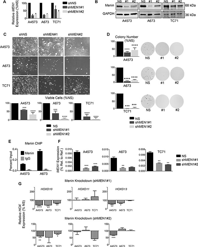 Figure 4: Menin has an oncogenic function in Ewing sarcoma. qRT-PCR (A) and western blot (B) showing menin knockdown. (C) Brightfield images (top) and histograms (bottom) show reduced cell growth with menin knockdown. (D) Histograms (left) and representative images (right) of soft agar assays. (E) Menin ChIP at the HOXD13 promoter. N = 2 experiments. (F–G) qRT-PCR depicting expression of menin (F) and posterior HOXD genes (G). *p < .05, **p < .01, ***p < .001, ****p < 0.0001. N = 3 experiments.