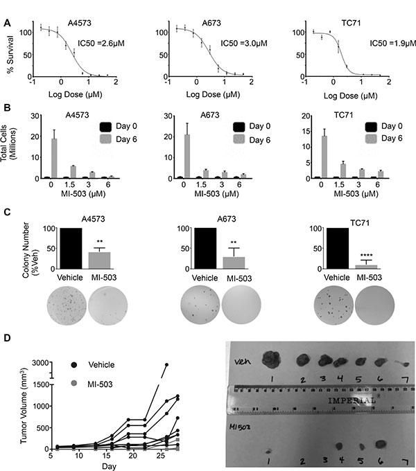 Figure 5: MI-503 inhibits Ewing sarcoma cell expansion and tumorigenicity. (A) IC50 curves and (B) trypan blue assay in MI-503 treated cells. (C) Histograms (top) and representative images (bottom) of soft agar assays in cells pre-treated with MI-503 or vehicle. N = 3 experiments. **p = .002, ****p < 0.0001. (D) Left: Spider plot depicting growth rates of individual tumors pre-treated with vehicle (Black Circle) or 6 μM MI-503 (Grey Square). N = 8 mice. Right: Image of tumors extracted on day 28.