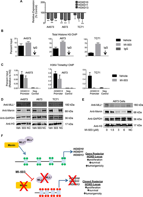 Figure 6: MI-503 treatment of Ewing sarcoma leads to loss of posterior HOXD gene and MLL and menin protein expression. (A) qRT-PCR data depicting reduced HOXD10, HOXD11, and HOXD13 expression with MI-503 treatment. *p < .05, **p = .003. (B) Increased histone H3 at the HOXD13 promoter after MI-503 treatment. (C) Reduced H3K4me3 at the HOXD13 promoter with MI-503 treatment. Control is a gene desert region telomeric to the posterior HOXD cluster. Error bars in all panels depict mean ± SEM. (D). Western blot depicting MLL1 and menin protein expression after 6 day treatment with MI-503 or MI-NC. (E) Western blot showing dose-dependent down-regulation of MLL1 and menin expression with MI-503 treatment. (F) Model of epigenetic activation of posterior HOXD gene cluster in Ewing sarcoma that is disrupted by exposure of cells to MLL-menin interaction inhibitor.
