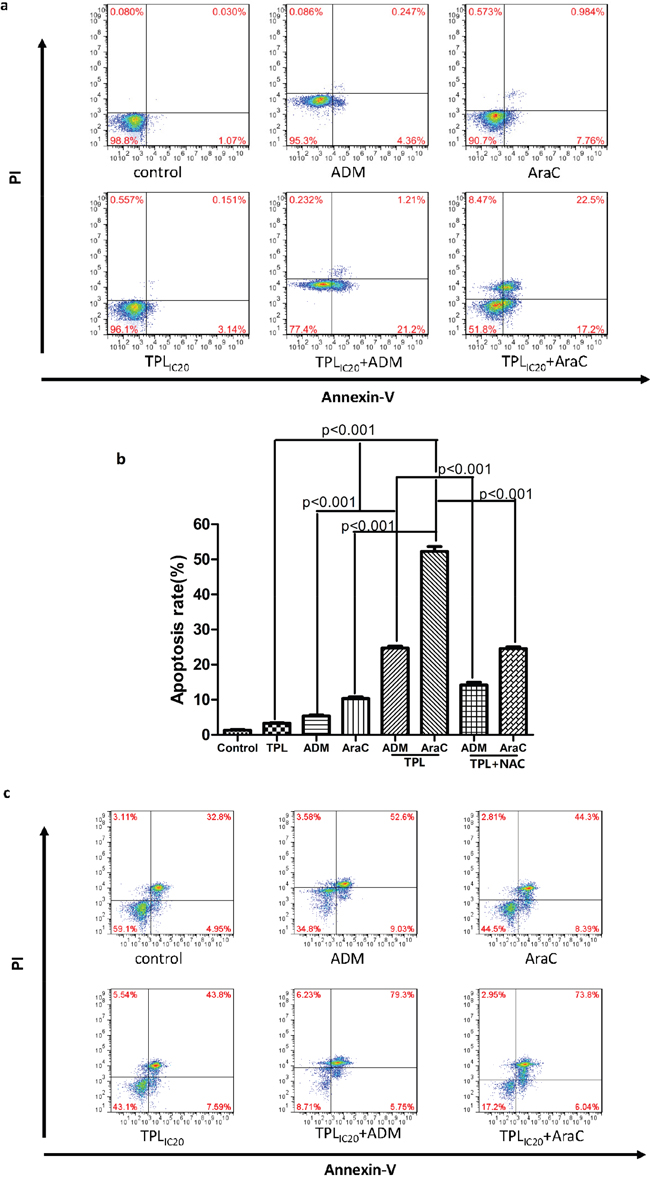 Figure 2: TPL increased apoptosis induced by araC or ADM in NALM-6/R cells, an event blocked by the antioxidant NAC, as well as in primary R/R ALL cells. a. NALM-6/R cells were exposed to araC (5 μM) or ADM (0.5 μM) ± TPL (IC20: 10 nM) for 48 h, after which apoptotic ratios were determined by Annexin V/PI staining and flow cytometry. b. A column chart summarizes apoptotic ratios of NAML/R cells after drug treatments as described above for at least three independent experiments (mean ± SD). In addition, 30 mM NAC was added for 2 h to block ROS generation prior to combined treatment with TPL plus araC or ADM. c. Primary cells isolated from a patient with R/R ALL (patient #1 as shown in Table 3) were incubated with araC (5 μM) or ADM (0.5 μM) ± TPL (IC20: 10 nM) for 48 h, after which apoptosis was analyzed Annexin V/PI staining and flow cytometry.