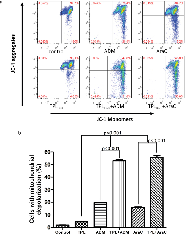 Figure 3: Combined treatment with TPL and araC or ADM results in mitochondrial injury in NALM-6/R cells. a. NALM-6/R cells were exposed to araC (5 μM) or ADM (0.5 μM) ± TPL (IC20: 10 nM) for 48 h, after which mitochondrial membrane potential (ΨΔm) was determined by monitoring JC-1 aggregates using flow cytometry. b. A column chart summarizes percentages of NAML/R cells with loss of ΨΔm (or mitochondrial membrane depolarization) after drug treatments as described above for at least three separate assays (mean ± SD).