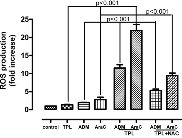 Figure 4: Combined treatment with TPL and araC or ADM induce ROS production in NALM-6/R cells, an event prevented by NAC. NALM-6/R cells were exposed to araC (5 μM) or ADM (0.5 μM) ± TPL (IC20: 10 nM) for 12 h, as well as addition of 30 mM NAC for 2 h prior to combined treatments, after which ROS was measured using H2DCFDA dye and flow cytometry. Values indicate fold increases, compared to untreated control, for three separate experiments (mean ± SD).