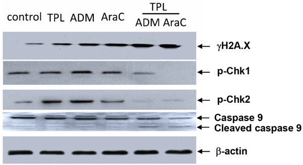 Figure 6: Co-treatment with TPL and araC or ADM disrupts DNA damage checkpoint and induces caspase 9 activation in NALM-6/R cells. NALM-6/R cells were exposed to araC (5 μM) or ADM (0.5 μM) ± TPL (IC20: 10 nM) for 48 h, after which Western blotting analysis was performed to monitor expression of γH2AX, p-Chk1, and pChk2, as well as cleavage/activation of caspase 9. The representative blots are shown for three independent experiments.