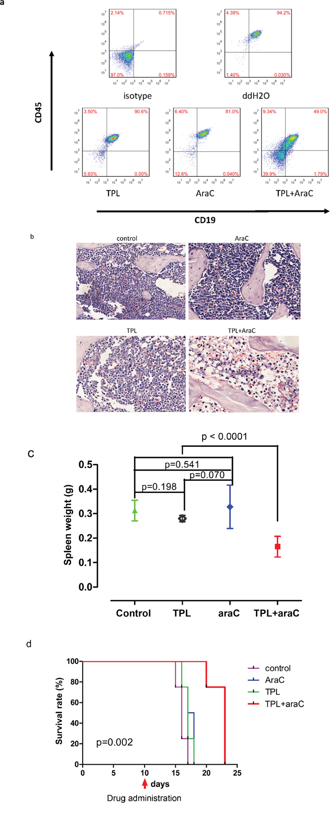 To validate the anti-leukemia activity of the regimen combining TPL and araC in vivo, we established a xenograft mouse model by intravenous injection with chemoresistant NALM-6/R cells into NSI (NOD-SCID-IL2Rg-/-) mice. Of note, mice treated with TPL plus araC showed a substantial reduction of tumor burden, manifested by a marked decrease inCD45/CD19 double-positive cells in bone marrow, compared to mice receiving each single agent (Figure 7a). Consistently, histopathology revealed a remarkable reduction of leukemia cell infiltration in bone marrow of mice receiving treatment with TPL plus araC (Figure 7b). Further, average spleen weight of mice treated with TPL plus araC (0.17 ± 0.26 g) were significantly lower than those of mice in the control group (0.31 ± 0.23 g), as well as each single agent group (0.28 ± 0.01g for TPL alone and 0.33 ± 0.56 g for araC alone; P <0.0001 for each case; Figure 7c). Last, Kaplan-Meier analysis showed that the combination of TPL with araC significantly prolonged animal survival, compared to TPL or araC alone (P < 0.01, Figure 7d).