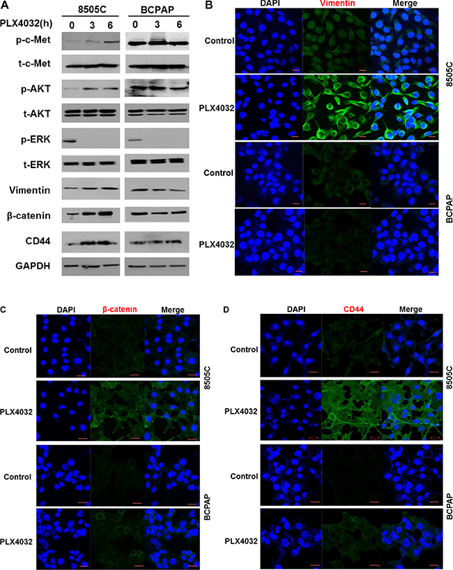 Figure 2: Expression of EMT related markers in 8505C and BCPAP to 1 μM PLX4032 treatment for 9 h. (A) Western blot analysis after PLX4032 treatment in 8505C cells. (B) Immunofluorescence confocal microscopy of vimentin. (C) Immunofluorescence confocal microscopy of β-catenin. (D) Immunofluorescence confocal microscopy of CD44.