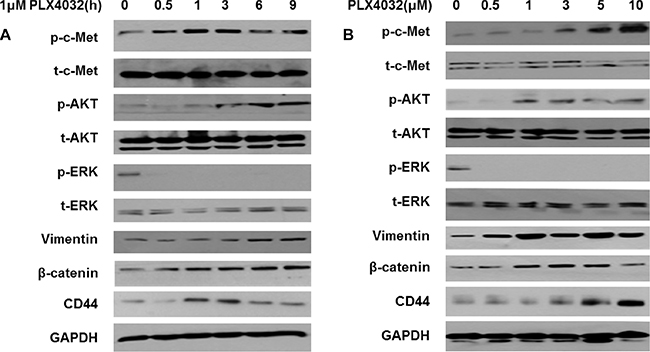 Figure 3: PLX4032 treatment increases EMT via over-expression of PI3K/AKT pathway mediated by p-c-Met in 8505C. (A) Western blot analysis after treatment of 1 μM PLX4032 of increasing treatment times in 8505C cells. (B) Western blot analysis after treatment of PLX4032 of increasing dosages for 6 h in 8505C cells.