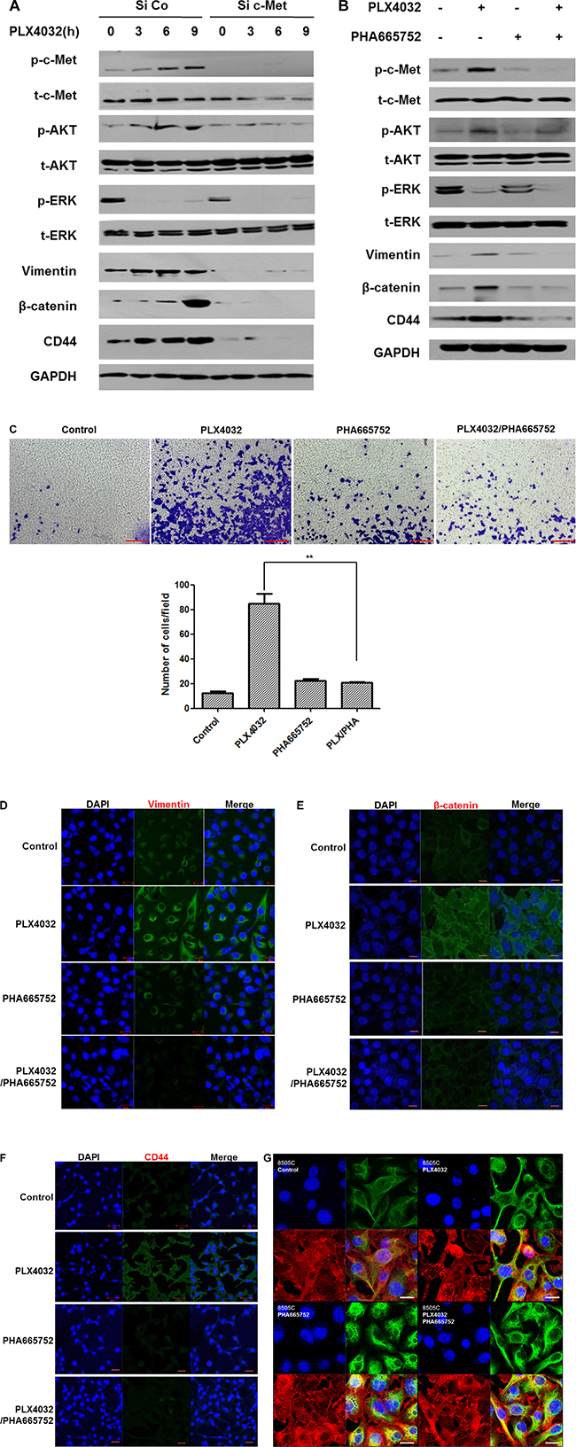 In accordance with the previous results, vimentin, β-catenin, and CD44 were over-expressed together with increased levels of p-c-Met and p-AKT, following PLX4302 treatment. Whereas there was no change except for the decrease of p-c-Met upon PHA665752 treatment, all expression levels of p-c-Met, p-AKT, p-ERK, and EMT related markers were decreased following combinatorial treatment of PLX4032 with PHA665752 (Figure 4B).