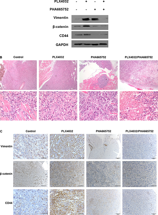 Figure 5: Effects on EMT following PLX4032 and PHA665752 treatment in a xenograft mouse model orthotopically injected with 8505C cells. Orthotopic injection of 8505C cells in thyroid glands of BALB/c nude mice were done and randomly divided into four groups with different treatment conditions as follows; DMSO (20 mg/kg/day), PLX4032 (20 mg/kg/day), PHA665752 (10 mg/kg/day), and combinatorial PLX4032 (20 mg/kg/day) and PHA665752 (10 mg/kg/day) treatment. (A) Western blot analysis of intratumoral protein expression from the obtained tumor specimens in each group. (B) Histopathological analysis by H & E staining from tumor tissue samples obtained from mice of each group. (C) Immunohistochemistry of tumor tissues from each treatment group.