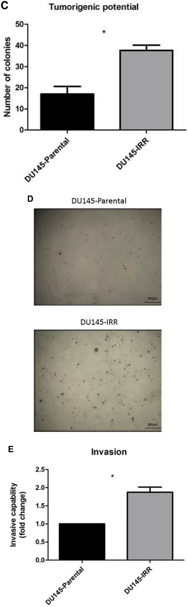 We then used the soft agar colony formation assay to evaluate anchorage-independent cellular growth in vitro. The soft agar assay is the gold standard for cellular transformation and growth in soft agar is strongly correlated to tumorigenicity in animals [13]. Consistent with a more aggressive phenotype, tumorigenic potential was significantly enhanced in DU145-IRR cells compared with DU145-Parental cells (mean number of colonies 37.7 ± 1.4 (IRR) vs. 17 ± 2.1 (Parental); p = 0.001; Figure 1C, 1D).
