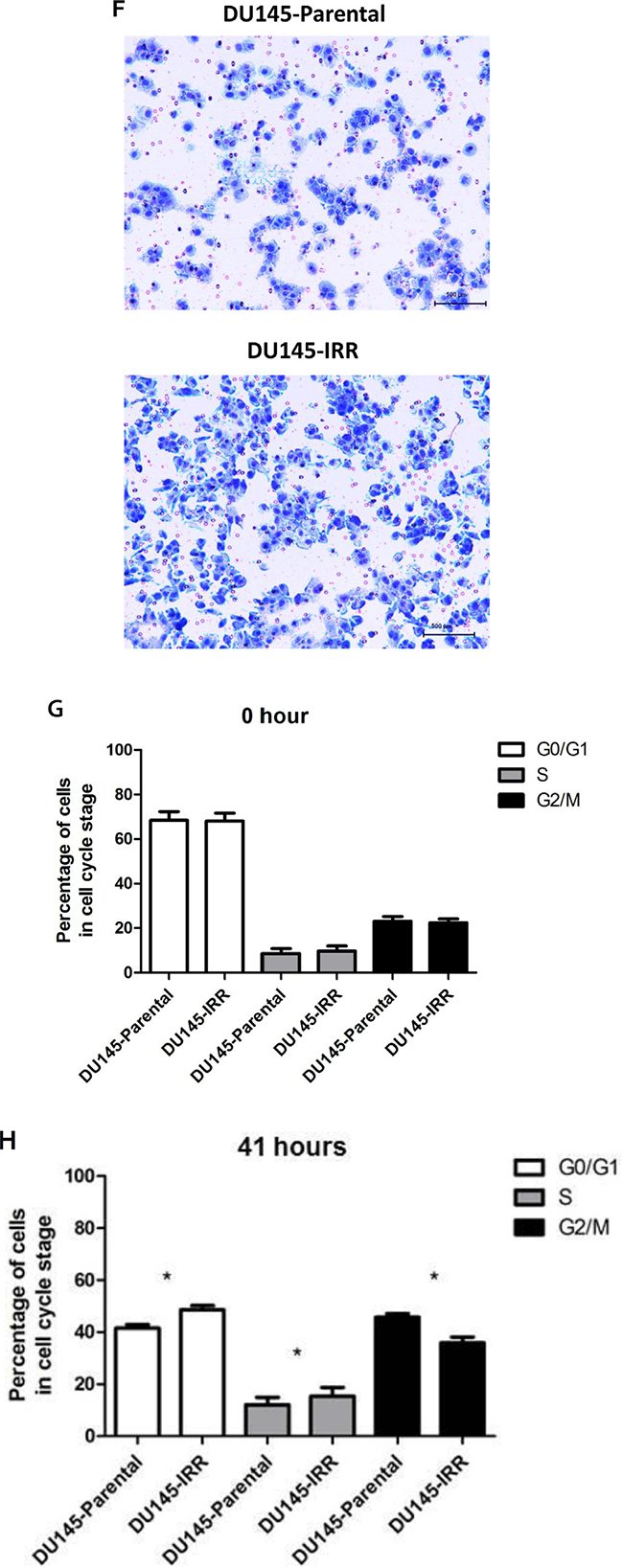 Figure 1: DU145 cells surviving RT are IRR and have an aggressive phenotype characterized by increased proliferation, invasive potential, and impaired G2-M cell cycle arrest. A. DU145 cells were mock irradiated with 0 Gy (DU145-Parental) or irradiated with a total of 2 Gy × 59 daily fractions of IR (DU145-IRR), radiation clonogenic survival assays were performed, and surviving fraction fitted to the linear-quadratic equation. B. Cell counts of viable DU145-Parental and DU145-IRR cells following mock IR (0 Gy) or 6 Gy dose of IR. C. Soft agar assay of DU145-Parental and DU145-IRR cells. D. A representative soft agar experiment out of three experiments (scale bar denotes 500µm). E. Matrigel transwell invasion assay of DU145-Parental and DU145-IRR cells. F. A representative invasion assay out of three experiments (scale bar denotes 500µm). Cell-cycle profiles of DU145-Parental and DU145-IRR cells following a 6 Gy dose of IR at G. 0 hour or H. 41 hours. Means, SDs, and differences of statistical significance are denoted by * (p < 0.05); n = 3 independent experiments for each experiment.