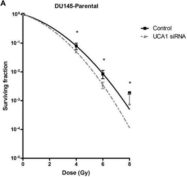 UCA1 was originally identified as being overexpressed in bladder cancer and it functions as an oncogenic lncRNA in a variety of different tumor types [10]. We found that UCA1 expression was strikingly high in PCa cells resistant to IR, suggesting its role in therapy resistance. The effect of UCA1 expression in tumor progression, invasion and metastasis is previously described [11]. However, the biological role and underlying mechanism of UCA1 in RT response has remained undefined. We discovered UCA1 as one of the important mediators of radiation response. Using a siRNA knockdown strategy, we further demonstrated that UCA1 knockdown could improve radiosensitivity in both classic PCa cell lines and IRR-PCa cells, and largely reverse the aggressive phenotype observed. To our knowledge, this is the first study investigating the impact of UCA1 on response to radiation in cancer cells.