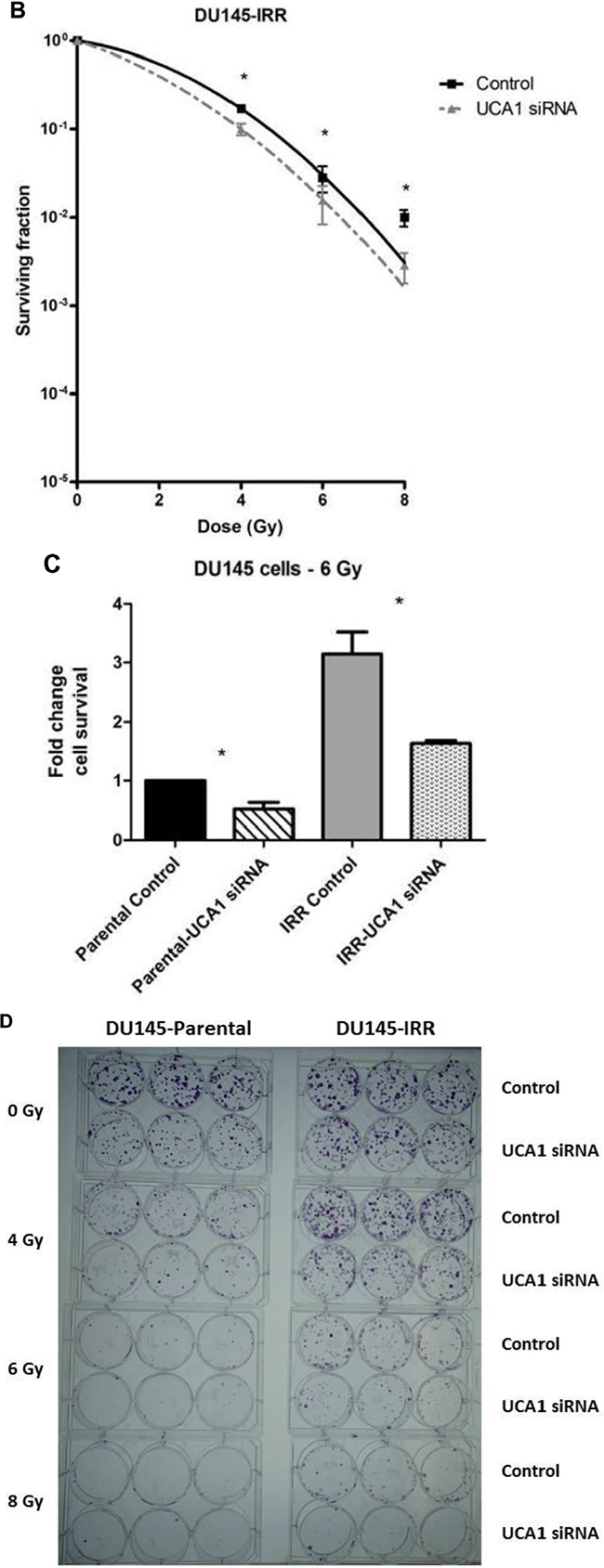 Figure 2: UCA1 knockdown improves radiosensitivity. A. DU145-Parental, B. DU145-IRR, C. The relative ratio of surviving DU145-Parental and DU145-IRR cells transfected with UCA1 siRNA following 6Gy of IR compared to corresponding controls. D. A representative clonogenic survival assay out of three experiments. Means, SDs, and differences of statistical significance are denoted by * (p < 0.05); n = 3 independent experiments for each experiment. E. PC3 and F. RWPE1 cells were transiently transfected with control or UCA1 siRNA, radiation clonogenic survival assays were performed, and surviving fraction fitted to the linear-quadratic equation. There were statistically significant differences in cell survival following 4 Gy, 6 Gy, 8 Gy and 10 Gy (RWPE1) of IR for all survival curves (p < 0.05).
