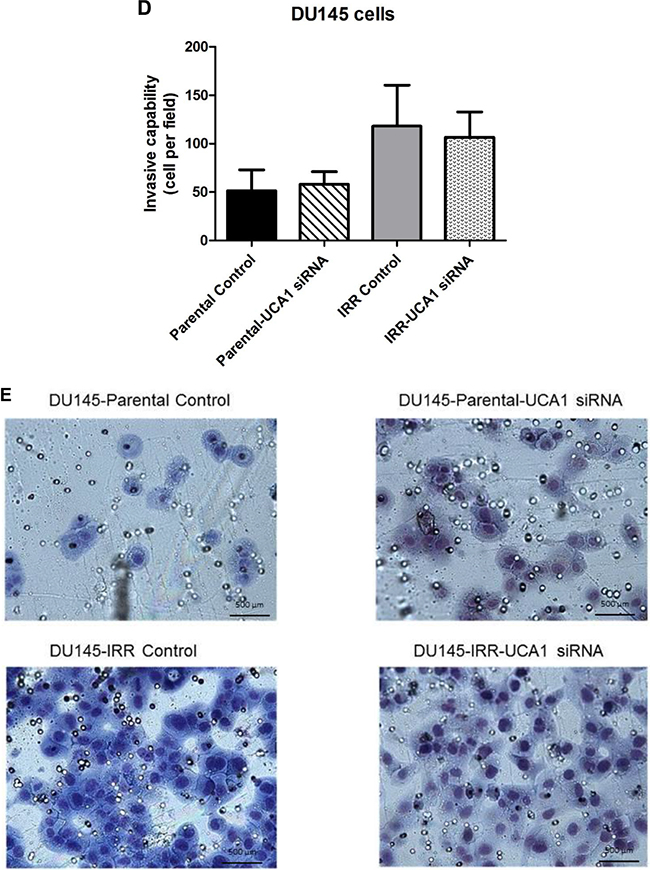 To further investigate the mechanism of UCA1 on aggression, we assessed invasiveness following UCA1 knockdown and observed that this did not significantly alter the invasive capacity of DU145-Parental (1.22 ± 0.34 vs. 1.0 (control), p = 0.67) or DU145-IRR cells (0.97 ± 0.3 vs. 1.0 (control), p = 0.7) (Figure 3D, 3E). Taken together, our results indicate that UCA1 knockdown can largely reverse the aggressive phenotype, modulate radiation sensitivity and inhibit tumorigenic potential.