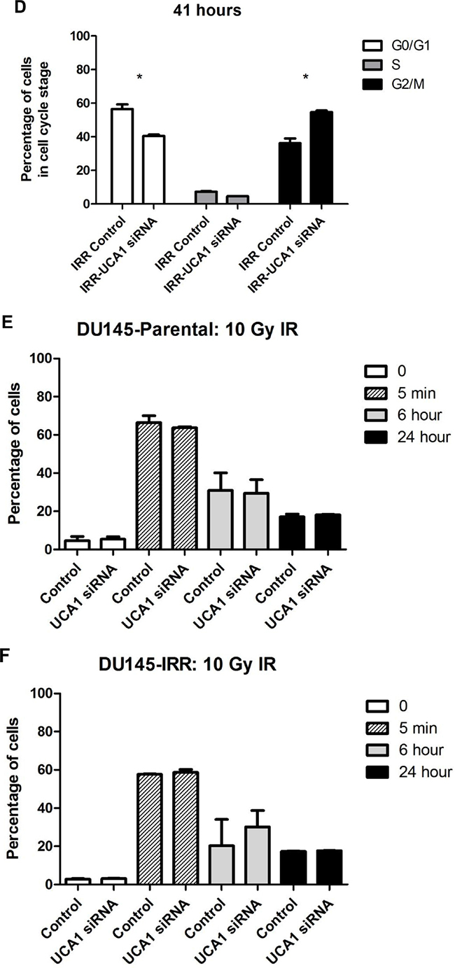 Figure 4: UCA1 depletion disrupts cell cycle progression and induces cell cycle arrest at the G2/M transition. Cell-cycle profiles of DU145-Parental A, B. and DU145-IRR C, D. cells transfected with UCA1 siRNA following a 6 Gy dose of IR at 0 hour or 41 hours, respectively. Staining for gamma-H2AX showed no significant difference in DSB repair kinetics following 10 Gy IR in (C, D) cells transfected with UCA1 siRNA following a 6 Gy dose of IR at 0 hour or 41 hours, respectively. Staining for gamma-H2AX showed no significant difference in DSB repair kinetics following 10 Gy IR in E. DU145-Parental and F. DU145-IRR cells transfected with UCA1 siRNA. Means, SDs, and differences of statistical significance are denoted by * (p < 0.05); n = 3 independent experiments for each experiment.