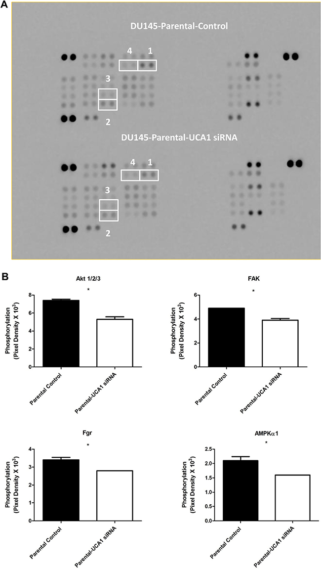 DU145-Parental control siRNA and DU145-Parental-UCA1 siRNA transfected cells were analyzed using the Human Phospho-Kinase Array (R&D Systems, USA: Catalog # ARY003B). This array specifically detects the relative phosphorylation levels of 39 individual proteins involved in cellular proliferation and survival. Cell lysates were incubated with the membrane. A cocktail of biotinylated detection antibodies, streptavidin-horseradish peroxidase and chemiluminescent detection reagents were used to detect the phosphorylated protein. The relative expression of phosphorylated proteins (performed in duplicates) was determined by quantification of scanned X-ray film using ImageJ (version 1.45), based upon pixel density.