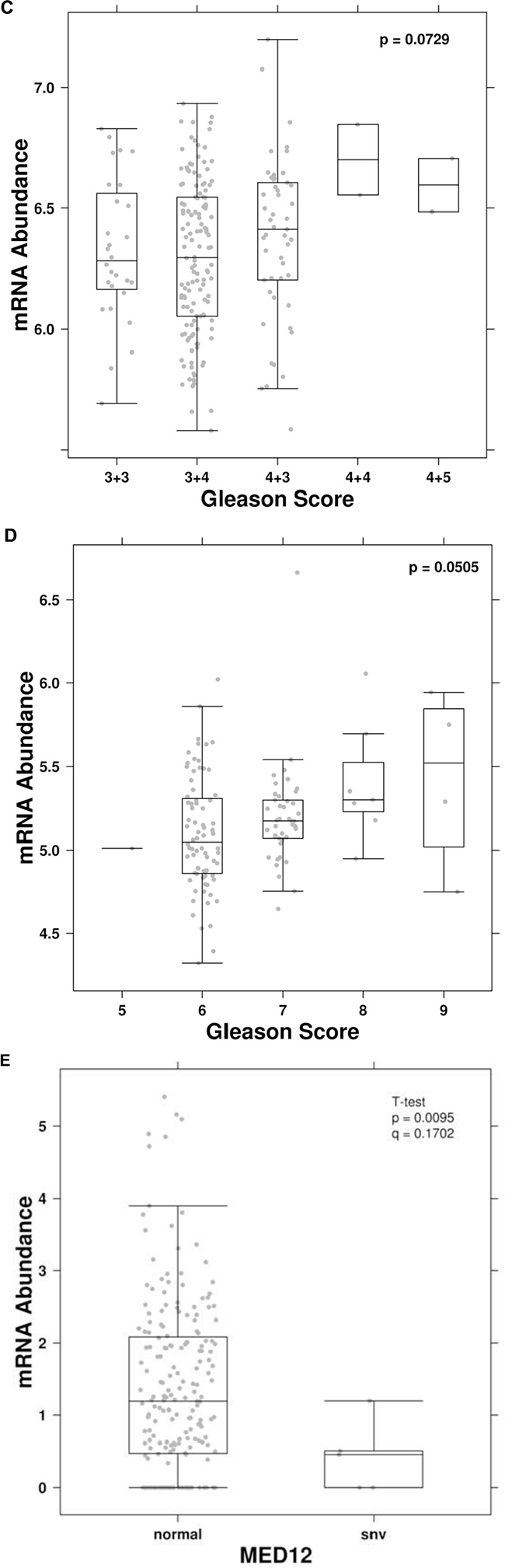 To determine if UCA1 expression was associated with outcomes in PCa, we first investigated UCA1 expression in the Canadian Prostate Cancer Genome Network (CPC-GENE) data, which includes sequencing data from a cohort of 209 patients with intermediate-risk PCa treated with RT or radical prostatectomy [26]. There was reduced biochemical relapse-free survival in high UCA1 expressor patients compared to low UCA1 expressor patients (81% vs. 94%, respectively; cox proportional hazard model, HR = 2.73, p = 0.05; Figure 6A). We next interrogated the publically available MSKCC Prostate Cancer database for mRNA expression data on 130 patients with clinically-staged low- to high-risk PCa who underwent surgical treatment. [27] UCA1 expression was higher in 18 (14%) of 130 patients. Patients with higher UCA1 expression had a significantly reduced disease-free survival at 5 years (5y-DFS) compared to those patients with lower UCA1 expression (5y-DFS = 51% vs. 82%, respectively; log-rank test p = 0.007; HR = 2.88; Figure 6B). Furthermore, we observed that higher expression of UCA1 is associated with a trend toward higher Gleason Score (GS) in both CPC-GENE and MSKCC cohorts (ANOVA; p values: 0.07 and 0.05, respectively; Figure 6C and D). However, there was no association between UCA1 expression and pre-treatment PSA (data not shown). We then used TCGA data to determine if UCA1 abundance is associated with recurrent single nucleotide variants (SNV). Interestingly, there was a strong association of UCA1 mRNA with MED12 point-mutations (Figure 6E). MED12 is reported to be recurrently mutated in PCa, [28] and MED12 overexpression is a frequent event in castration-resistant PCa. [29] Our bioinformatics analyses showed that patients with SNV in MED12, which could potentially result in impairment of its function, had lower levels of UCA1 expression (Figure 6E). Taken together, these findings indicate that higher expression of UCA1 is associated with unfavorable outcome in PCa.