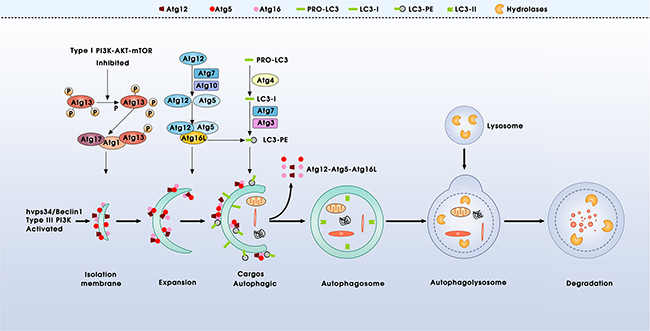 Figure 1: Schematic model of autophagy process. Autophagy is a multi-step process involving at least four main phases, which is controlled by more than 30 autophagy-related (Atg) proteins and mediated by two ubiquitin-like conjugation systems, Atg12-Atg5 and Atg8/LC3: including the initiation, vesicle expansion and completion, maturation and fusion, and ultimate degradation of the membrane and its contents within the lysosomes.