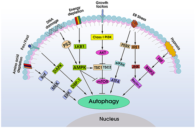 Figure 2: Schematic overview of autophagy-associated signaling pathways in cancer. Autophagy can be activated under multiple stress situations during cancer progression, including amino acid depletion, hyper-expression of death-associated protein kinase, DNA damage, energy depletion, endoplasmic reticulum (ER) stress, hypoxia and other diverse stresses. The key signaling molecules are the PI3K-AMPK-mTOR signaling pathways, which determinate the levels of autophagy in cancer. Other autophagy-associated signaling pathways, including DAPK-DRP1, PERK-eIF2α-ATF4, IRE1-ASK1-JNK1-Beclin-1, p53/LKB1-AMPK, Raf-MEK-ERK, HIF1-BNPI3-Beclin-1 pathways, which are activated by one or more stresses, also play an important role in regulation of autophagy in cancer.
