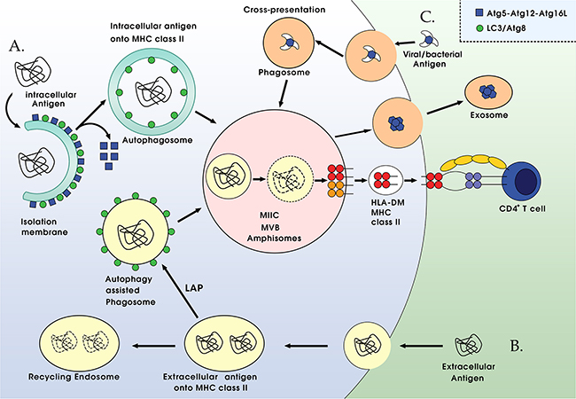 Figure 3: Autophagy-associated antigen presentation pathways. A. Autophagy is a novel pathway for intracellular antigen presentation. Autophagosomes, which recruit cytosolic antigens to MHC class II containing compartments (MIICs) for lysosomal degradation and presentation to CD4+ T cells with the assistance of the peptide-loading chaperone HLA-DM. B. Extracelluar antigens, including phagosomes or apoptotic cells, get decorated with Atg8/LC3 (a process termed LAP), which enhances fusion with lysosomes, and might also increase fusion with MIICs for antigen loading onto MHC class II molecules. C. Autophagy machinery seem to be beneficial for cross-presentation on MHC class I molecules in the donor cell. Both viral and tumor antigens benefit from the cross-presentation via autophagy in the infected or transformed cells. The process of multivesicular bodies (MVBs) releases exosomes may be the key molecular machinery for cross-presentation.