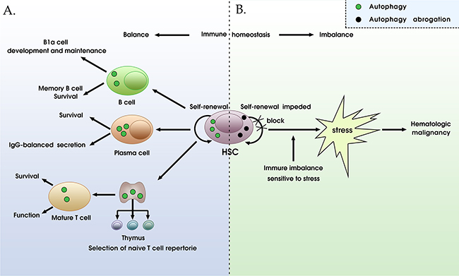 Figure 4: The roles of autophagy in immune homeostasis and tumorigenesis. A. The normal state of autophagy regulation mechanism is crucial for immune homeostasis. Autophagy plays a crucial role in positive and negative selection of naïve T cells and is essential for mature T cell homeostasis and maintaining periphery T cell survival during proliferation. Autophagy also affects self-renewal of hematopoietic stem cells (HSCs), B1a cell development, memory B cell maintenance, plasma cell survival, and IgG-balanced secretion. B. The abrogation of autophagy leads to immune homeostasis imbalance, HSCs self-renewal impeded, cells are more sensitive to various stresses, eventually resulting in the initiation and progression of blood cancers including leukemia, myelodysplastic syndrome, and lymphoproliferative disorder.